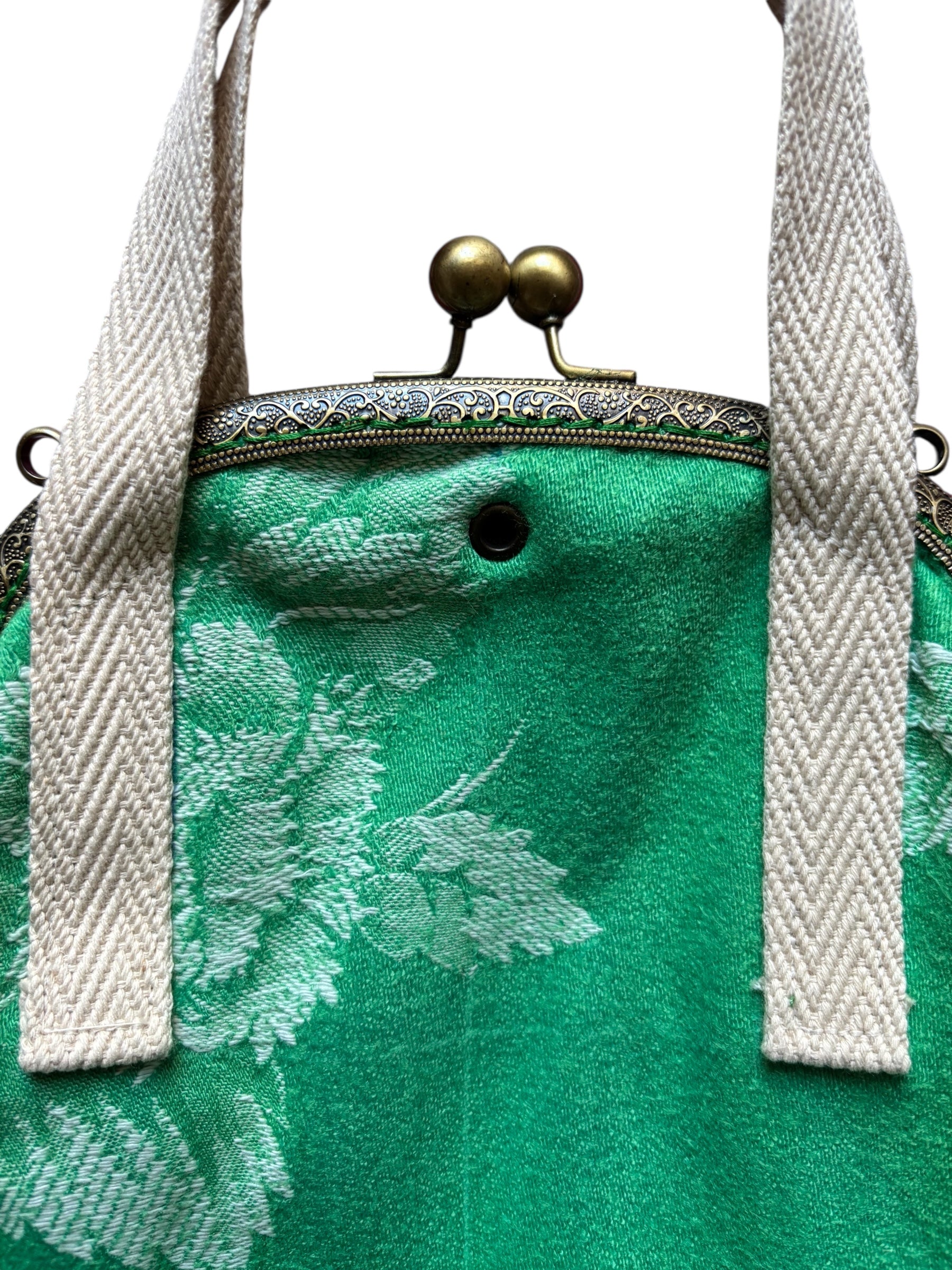👜 Una bolsa de tela de colchón antigua reciclada, con diseño vintage, práctica y única, con un agujerito perfecto para sacar el hilo del ovillo mientras haces ganchillo.