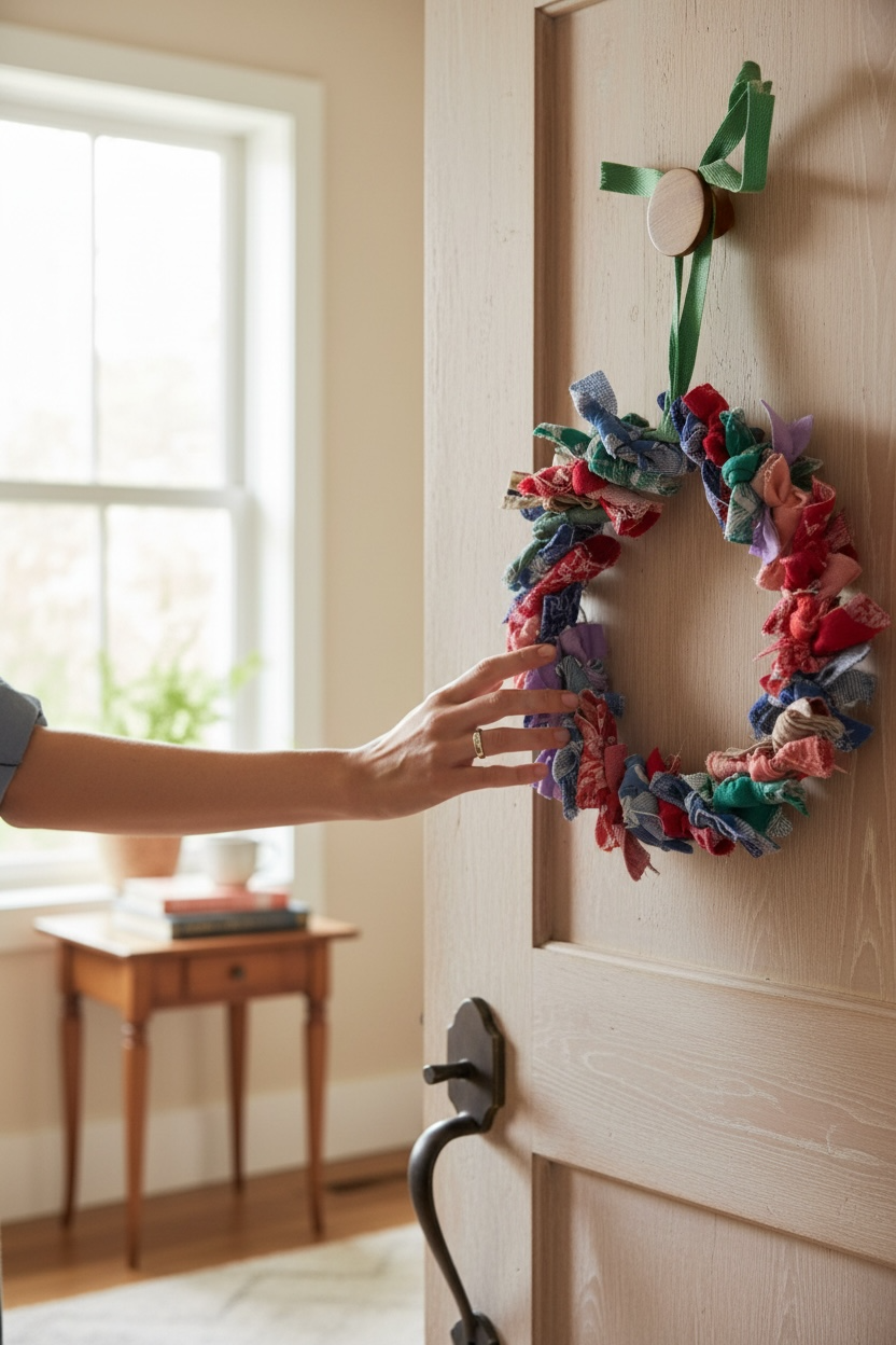 Corona de Navidad hecha con retales de tela de colchón antigua reciclada. Cada trozo una historia. Cada nudo una luz ✨