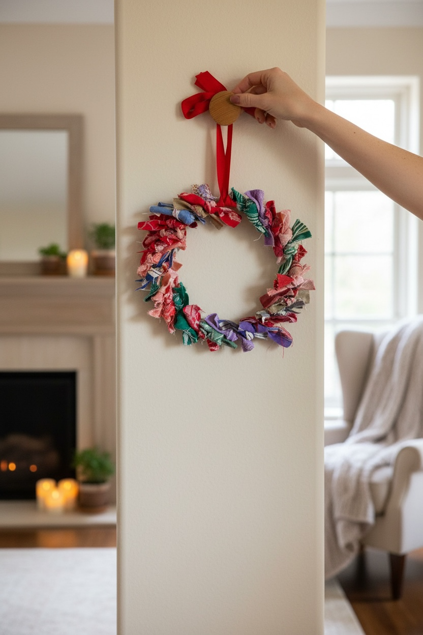Corona de Navidad hecha con retales de tela de colchón antigua reciclada. Cada trozo una historia. Cada nudo una luz ✨