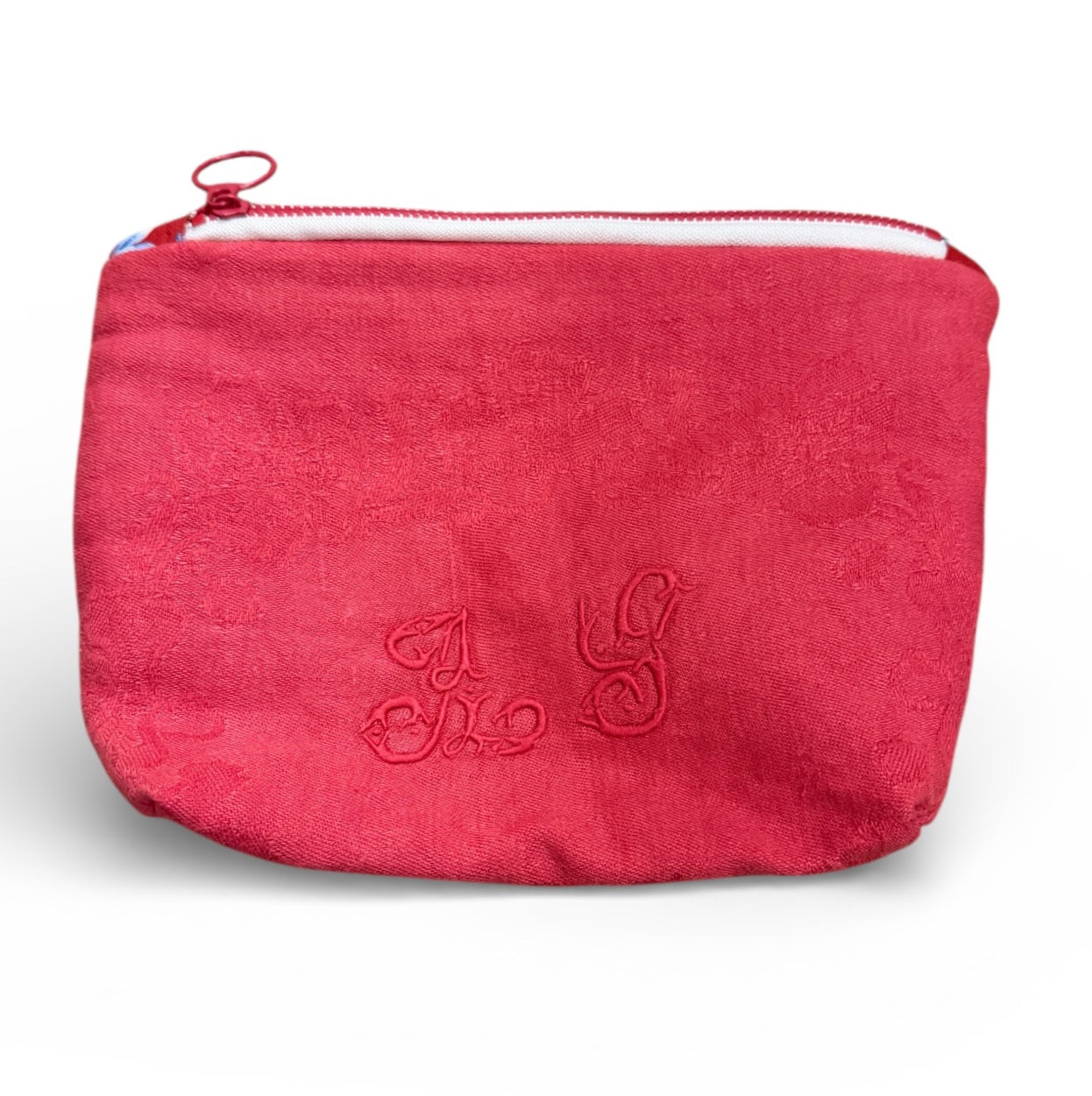 Neceser de tela adamascada con iniciales “AS” hecho a partir de una servilleta de lino antigua francesa (años 50)