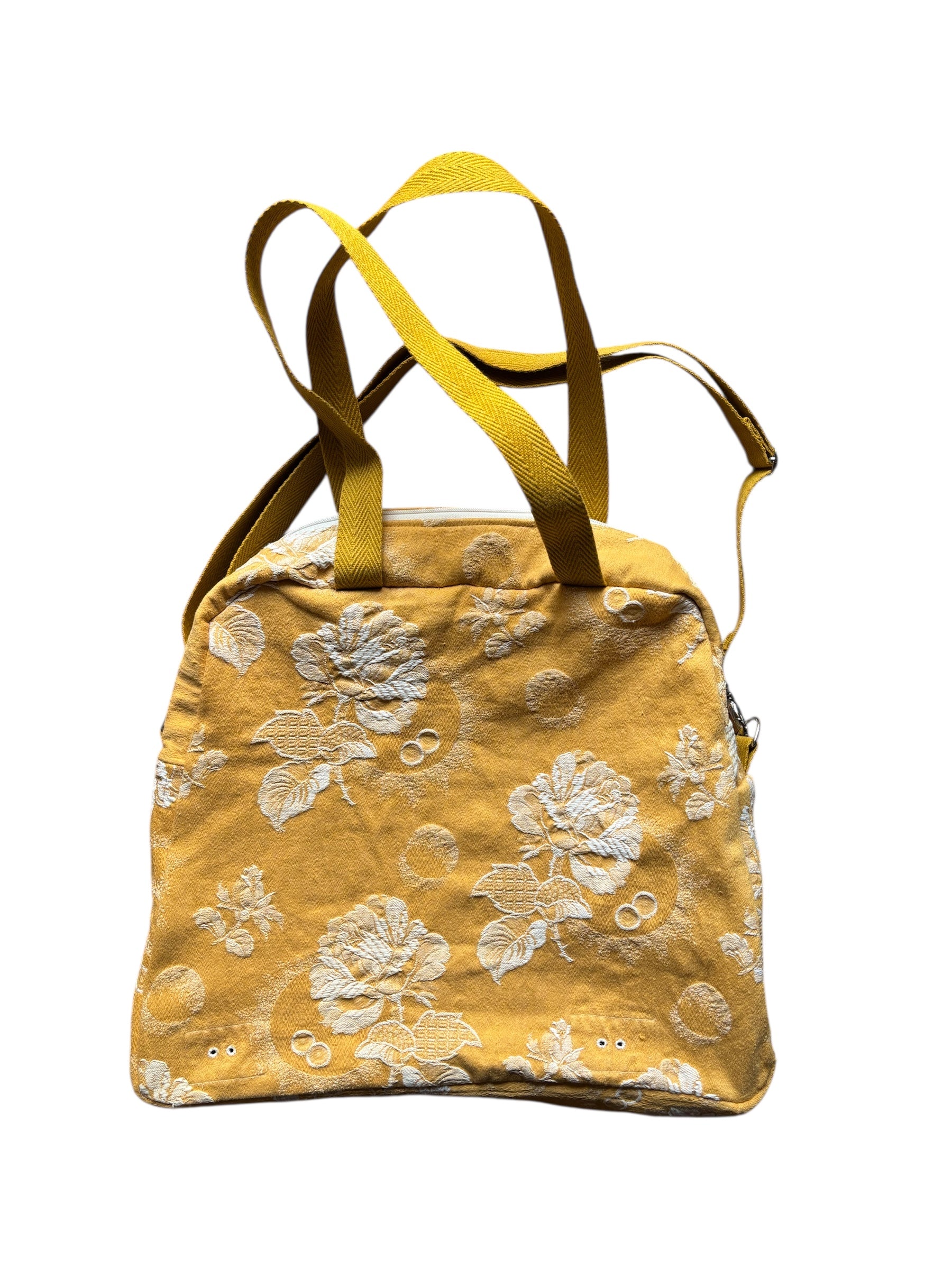 - Estampado floral de tela de colchón antigua reciclada, de los años 40 en color mostaza